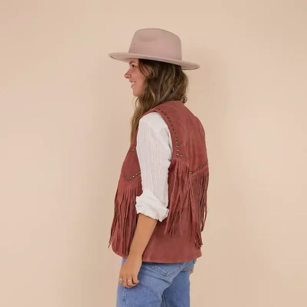 Gilet gemaakt van 100% suede.De binnenkant heeft een zijdezachte voering met het Moonrise logo. Het gilet is afgewerkt met studs en fringes.