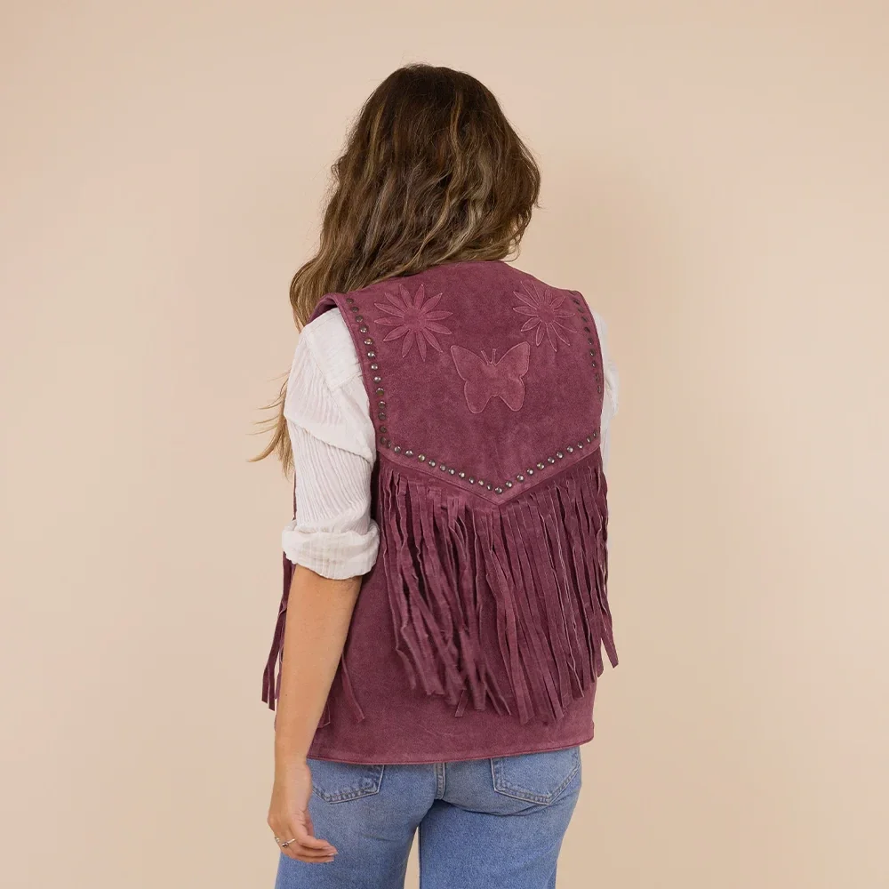 Gilet gemaakt van 100% suede.De binnenkant heeft een zijdezachte voering met het Moonrise logo. Het gilet is afgewerkt met studs en fringes.