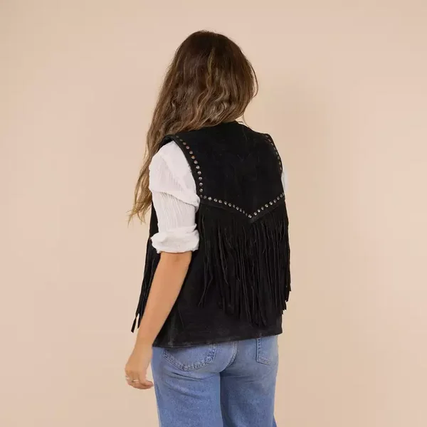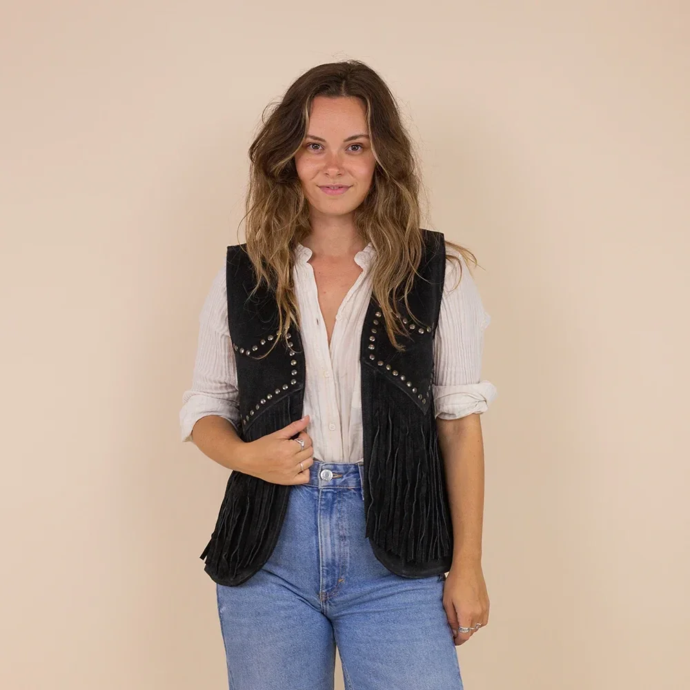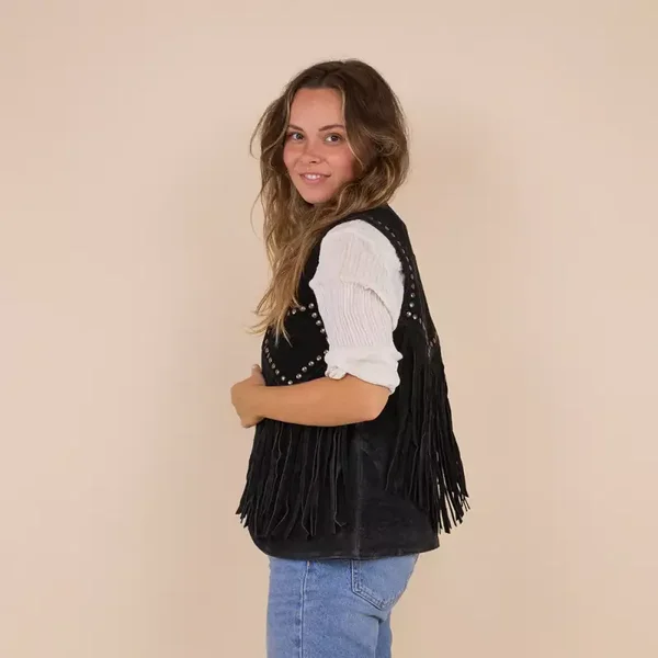 Gilet gemaakt van 100% suede.De binnenkant heeft een zijdezachte voering met het Moonrise logo. Het gilet is afgewerkt met studs en fringes.